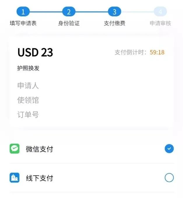 2. 如取证方式选择“到馆取证”,请关注APP订单状态,待订单进入“待取证/待邮寄”后,在使领馆办证大厅工作时间到场使用信用卡(Master或Visa卡)或现金支票缴费并领取新证件,办理费用为18美元/人。
