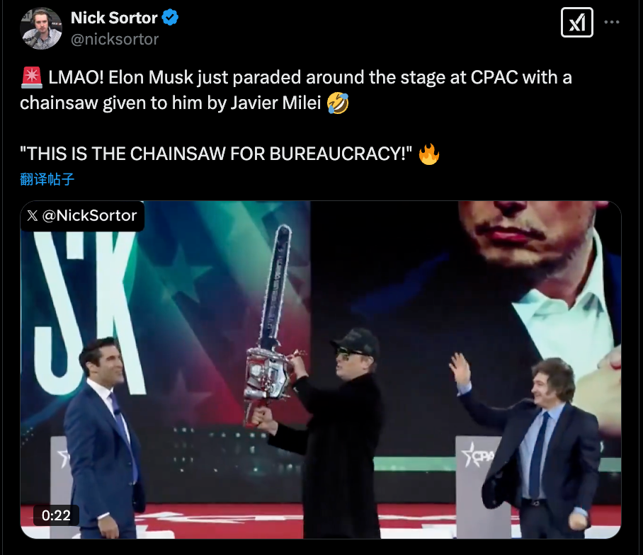 另外,2月21日周五,马斯克在一次保守派集会上挥舞着一把巨大的电锯,庆祝自己的新角色。他将其称为 “官僚主义的电锯”,并表示联邦政府中 “浪费现象无处不在”。
