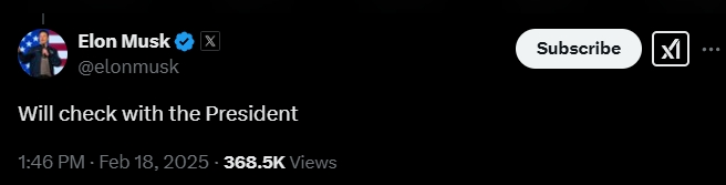 马斯克周二回复该帖子时说:“将与总统核实。”