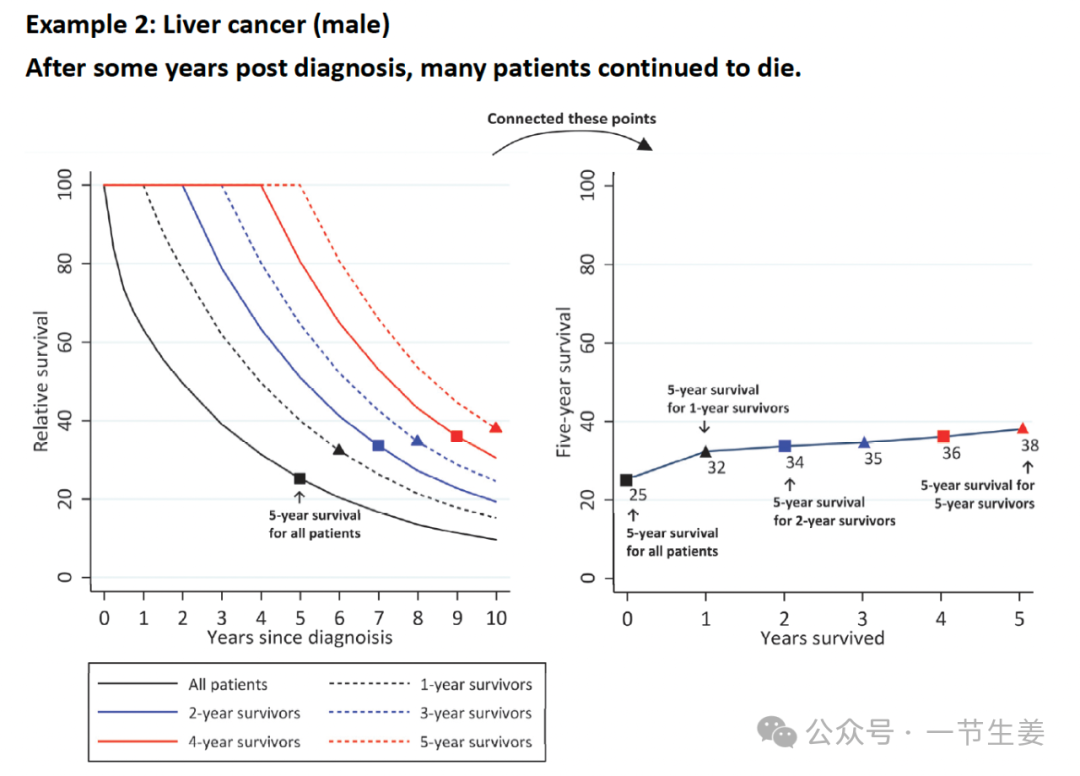 在上述论文中,研究者也作图示意了如何计算有条件5年生存率。
