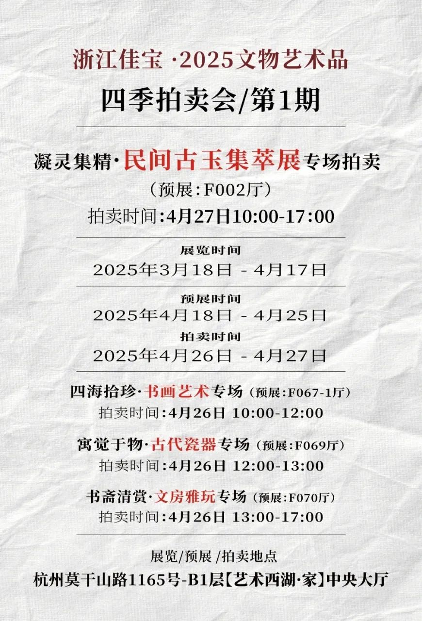 浙江佳宝书画艺术专场拍卖时间为4月26日10:00开始;古代瓷器专场拍卖时间4月26日12:00;文房雅玩专场拍卖时间4月26日13:00开始;民间古玉集粹展专场拍卖时间4月27日10:00开始