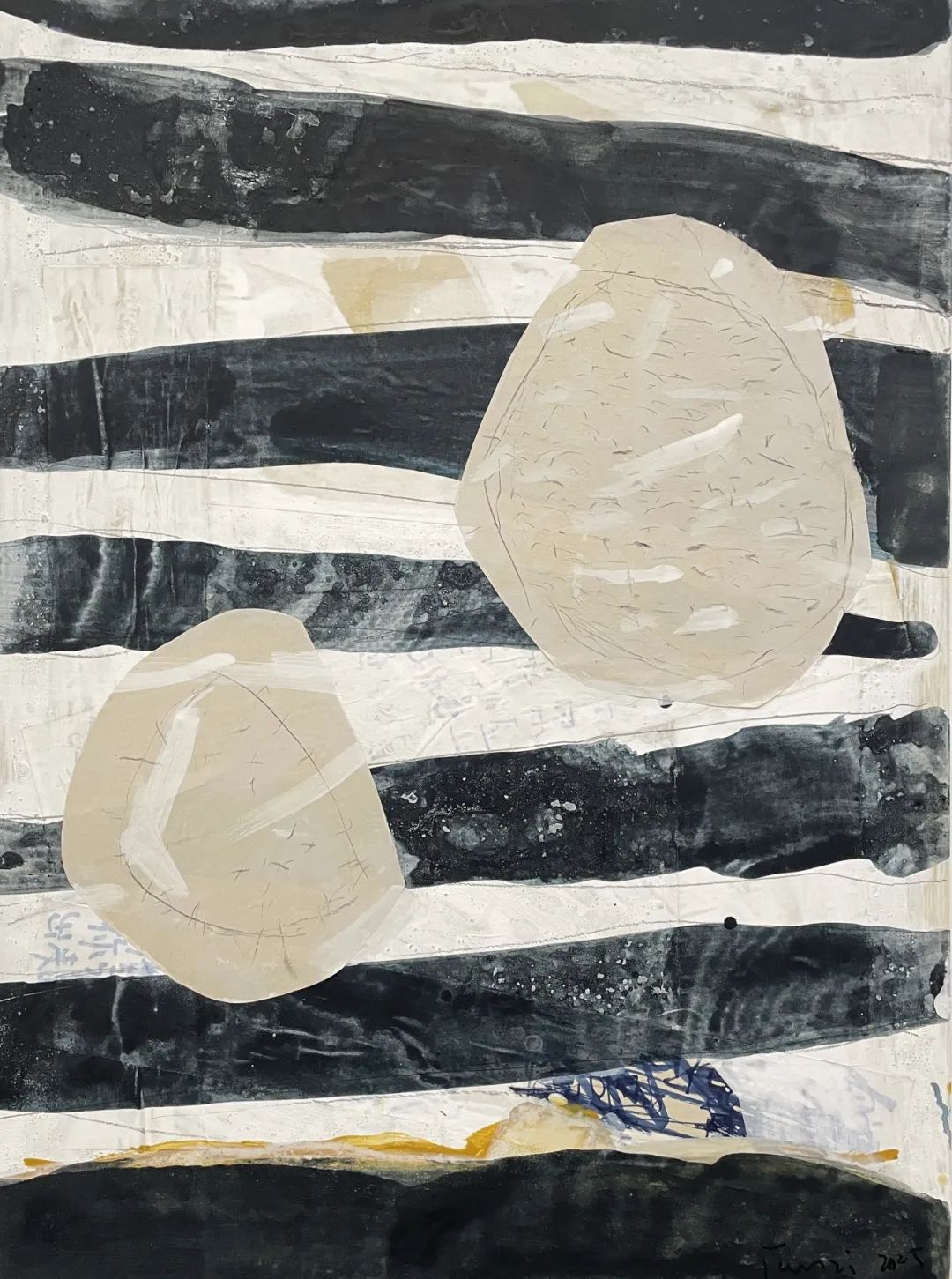 墨、丙烯、油画棒、手工粗布、国画颜色、宣纸拼贴