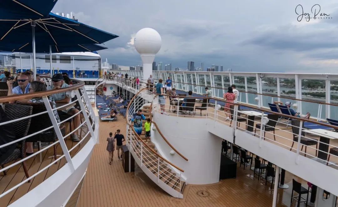 挪威天空号游轮空间很大,有多种多样的餐饮和娱乐空间,船尾11层甲板设有酒吧、餐厅、游泳池等设施。随着一声悠长而深沉的汽笛声响起,游客们立马开启度假模式,泳池周围已经热闹非凡。