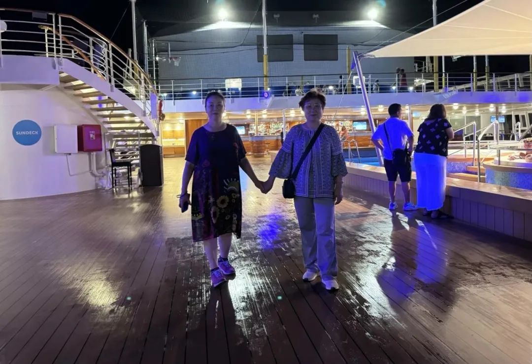 随着夜幕降临,甲板泳池边音乐响起,我们下场随着音乐节拍跳起舞来。