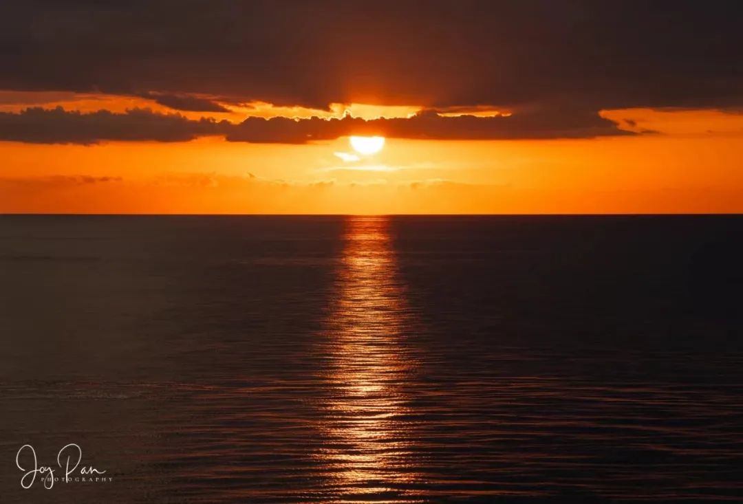 夕阳的余晖倾洒而下,天边的橘红与海面的光影交织成画