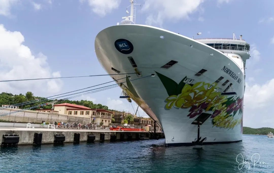 圣托马斯岛是美属维京群岛的一部分,面积80.9平方公里,人口5万多。我们乘坐游轮,特别喜欢把游轮当道具,从不同的角度拍摄这个巨型船体。