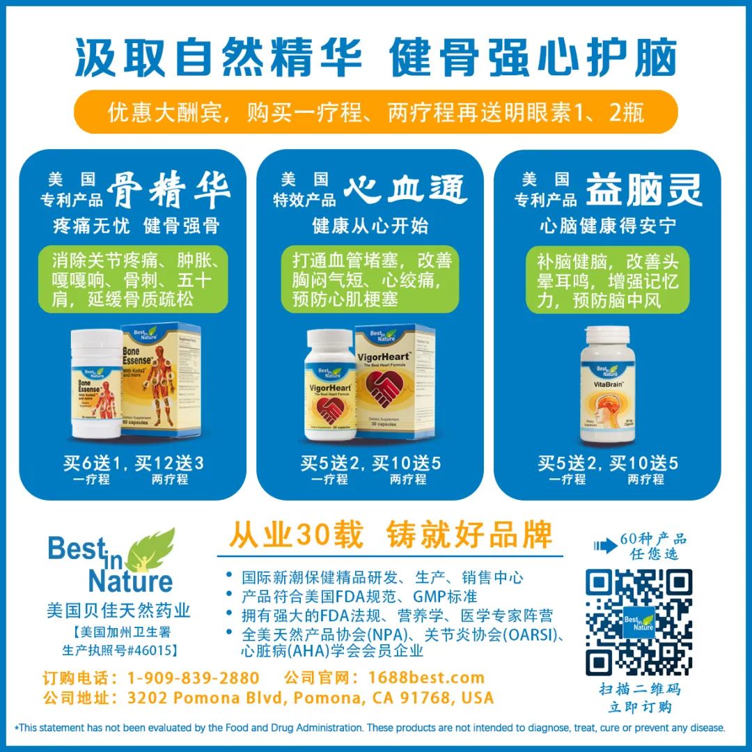 从业29载,铸就好品牌。美国贝佳天然药业(Best in Nature)拥有强大的医学、营养学专家阵营,产品多达60多种,符合FDA标准、GMP规范,功效卓著,有口皆碑。美国专利/特效产品【骨精华】【心血通】【益脑灵】【前列宝】【伊美宝】【明眼素】【肝好胶囊】【猛男胶囊】【加强型虾青素】等 “优惠大酬宾”进行时。