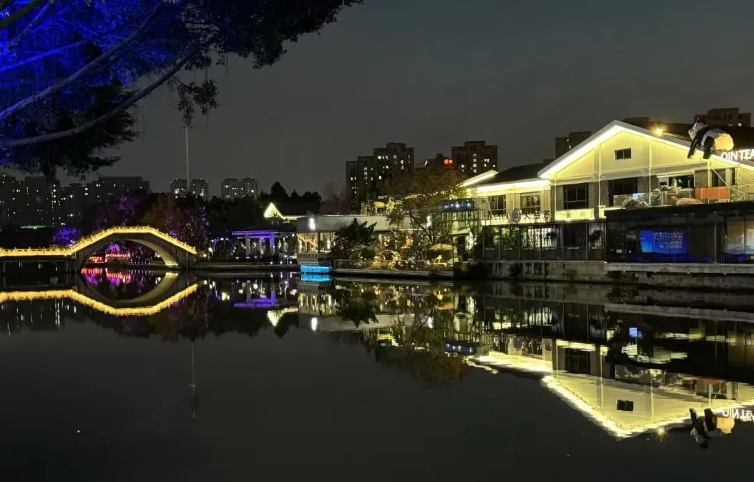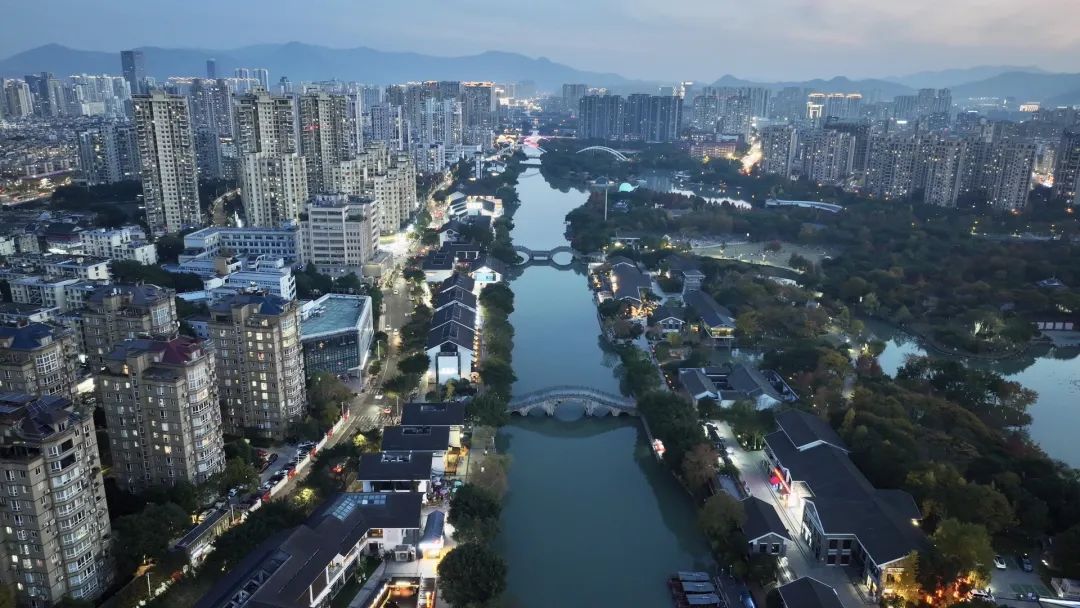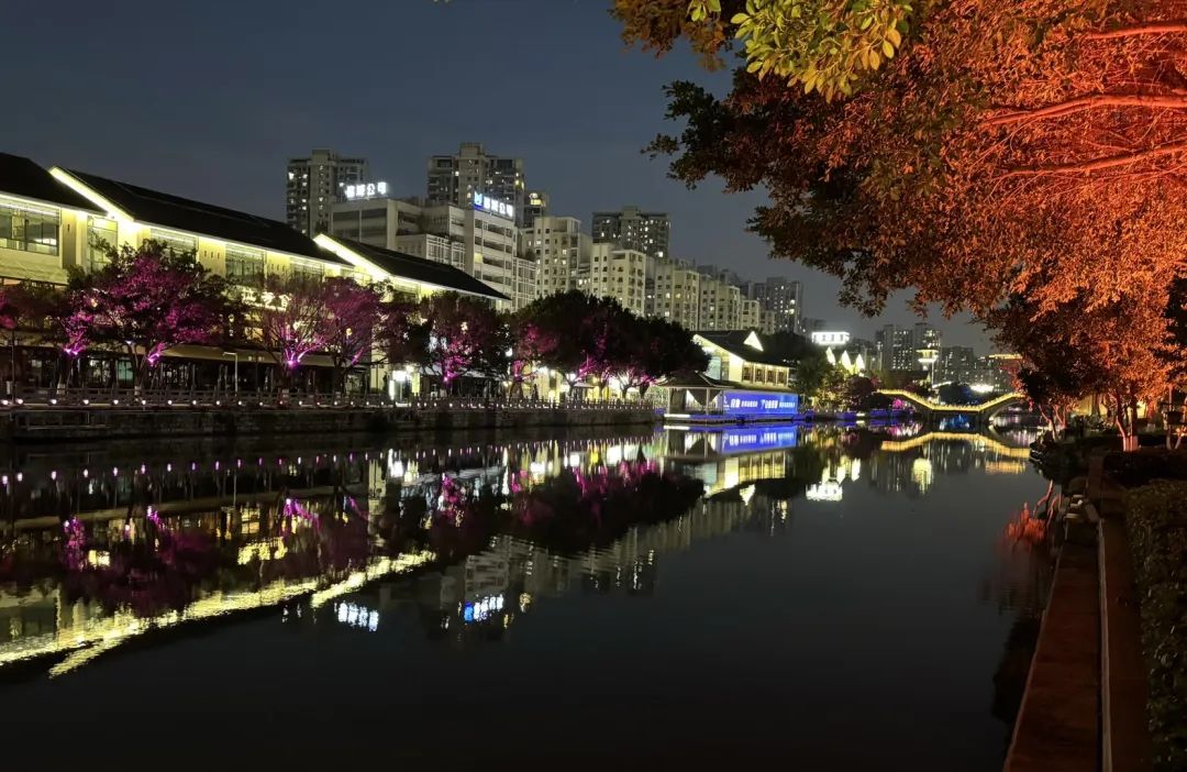 图3-5:南塘水域,清澈的河流悠然穿越座座桥梁,在晚霞与灯光的交相辉映下,两岸的高楼大厦与古朴的民宅瓦房展现出别样的璀璨。
