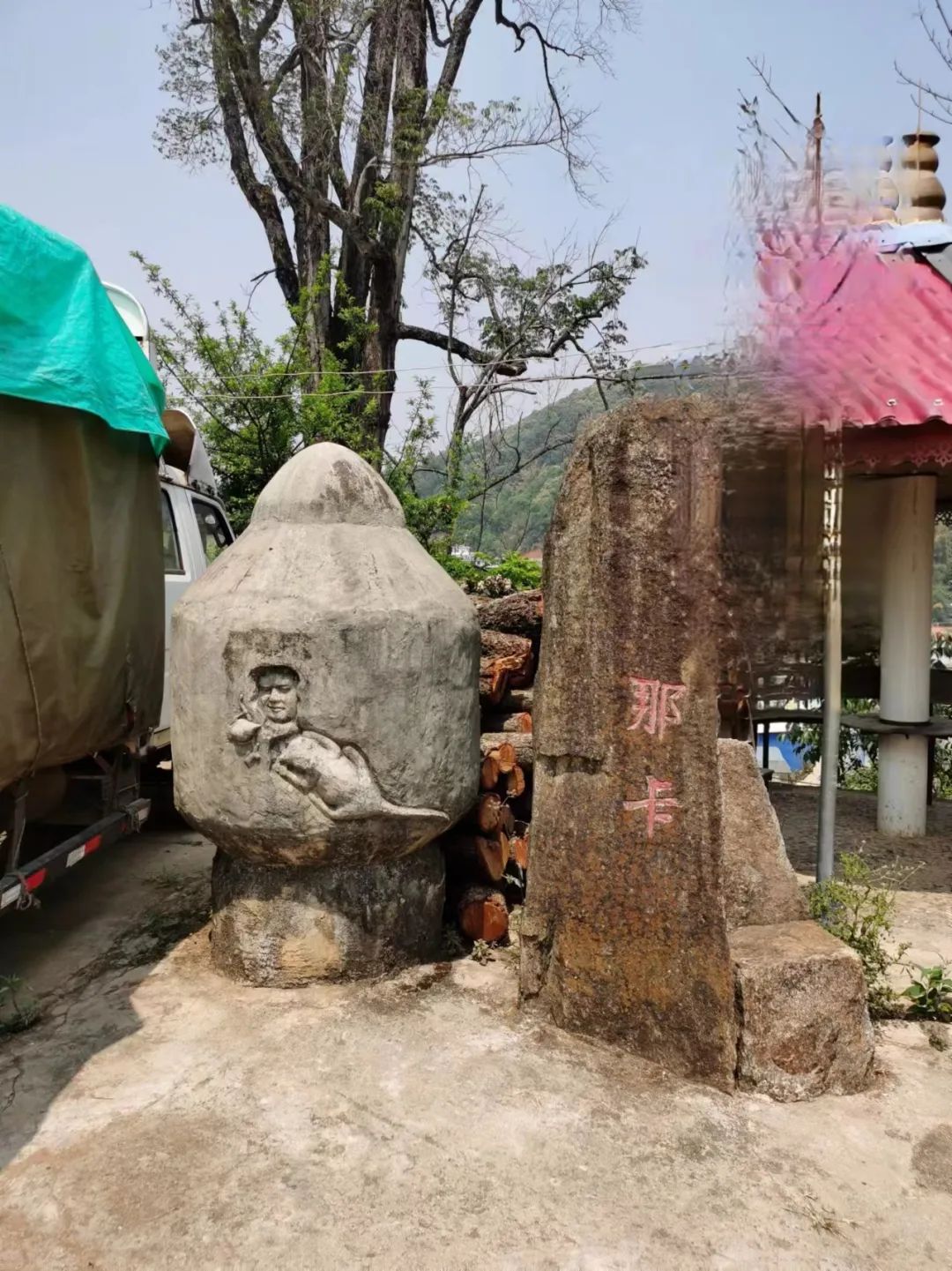 拉祜族自称是葫芦里面出来的民族,老鼠咬破闷了500年的葫芦,才有了拉祜族的祖先扎迪、娜迪。因而,葫芦、老鼠,都是他们的吉祥物。这个水泥雕像,看起来就是老鼠在啃咬葫芦,扎迪已经破圈在望。只是这个水泥匠的水平实在不敢恭维,怎么看都四不像(拉祜族创世神话,详细内容自行度娘,此不赘述)。