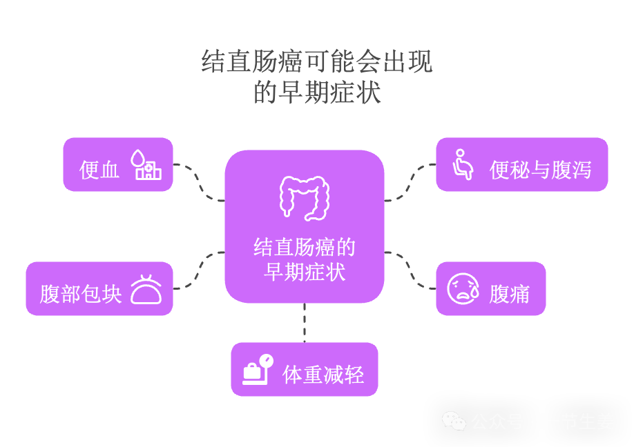 结直肠癌患者,早期会出现这样一些症状:便血、便秘或腹泻、腹痛、腹部包块、体重减轻……