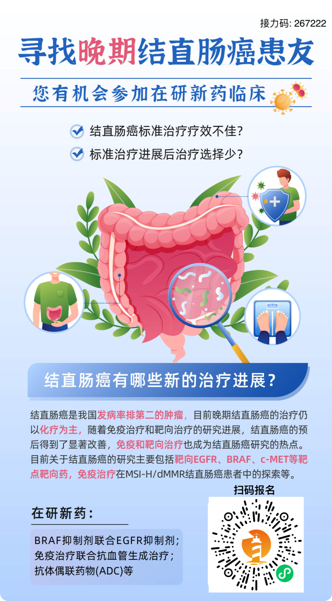 关于结直肠癌的治疗,目前有两项进行中的临床试验,正在招募结直肠癌患者。