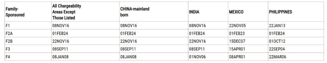 中国大陆出生亲属移民排期方面,F1类(公民的成年未婚子女)前进116天;F2-A类(永久居民的配偶及未成年子女)前进518天;F-2B类(永久居民的成年子女)前进38天;F3类(公民的已婚子女)前进38天;F4类(公民的兄弟姐妹)前进7天。