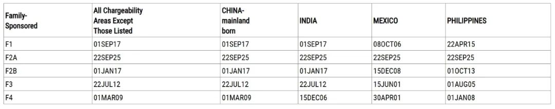 中国大陆出生亲属移民递件排期中,F2-A类前进113天,F4类前进59天,其余各类均原地踏步。