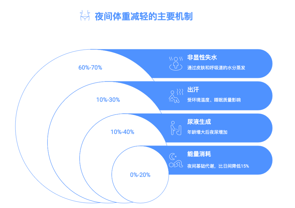 排尿:夜间排尿量和体重相关,按每小时 0.5-1 毫升/ 千克计算,70 公斤的人睡 8 小时,夜间尿量约 280-560 毫升,这部分水分排出也会让体重下降。