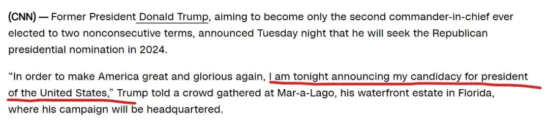 他竞选中说要建一堵墙,把西语移民挡在美国之外;上任初期,禁止部分穆斯林国家人士进入美国;还激化种族关系,比如在一名反抗议者被杀的弗吉尼亚州Charlottesville白人民族主义抗议活动中,说双方都有“非常好的人”;夸大危险也是常事,引发了许多美国人的愤怒和恐惧。川普在2017年就职演说中说:“犯罪、帮派和毒品偷走了太多生命,夺走了我们国家许多未实现的潜力”,而美国暴力犯罪率总体正呈下降趋势。在他作为总统的第一次演讲中说了那句著名的——“美国这场大屠杀就在这里停止,现在就停止”。随着大城市暴力犯罪率上升,共和党人在中期选举中一再利用这一点刺激选民。毫无疑问,川普会故技重施。许多共和党人私下、包括在国会山,会说不喜欢川普,但仍然支持他,尽管其任期内常常混乱不堪。这让许多左派人士感到困惑。但其原因是,川普正推动许多保守派所青睐的政策。他颁布了大部分有利于富人和企业的减税政策,在最高法院安插了三位倾向保守派的大法官,还出现过一段经济增长——直至疫情席卷全球。倾向保守派的大法官“见效”很快。法院彻底推翻了罗诉韦德案,将堕胎政策送回各州,关闭了美国数百万妇女的堕胎途径;法院还维护枪支所有者的权利,似乎准备未来进一步奉行保守的社会结构,这将影响未来几代人。川普有足够的资金再次参选,通过政治运作他已积累了数亿美元资金。正式参选意味着将整合共和党资源,这位“前政治素人+前地产开发商+电视真人秀明星”将重新扮演熟悉的角色,还是对国家安全和繁荣负责的内行总统呢?https://www.npr.org/2022/11/15/1044234232/trump-announces-run-president-2024