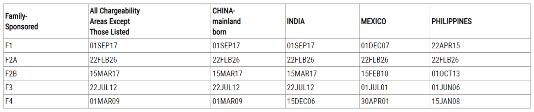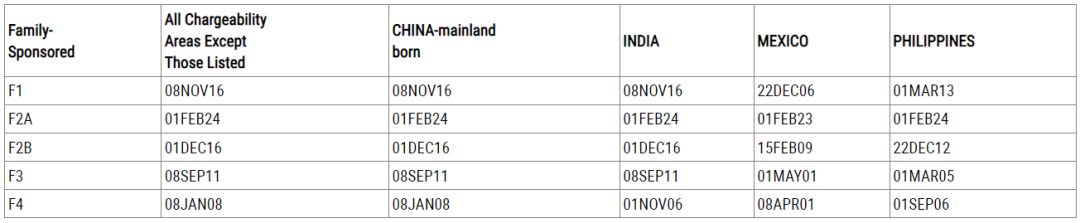 中国大陆出生亲属移民递件排期方面,F2A类(永久居民的配偶及未成年子女)前进32天,其余类别均原地踏步。