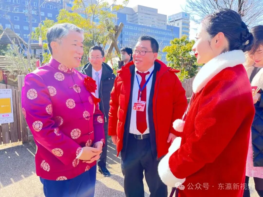 旅日专家学者王海峯(中)与侨领王艺武(左)、王自祥(右)在“2025大阪春节祭”现场