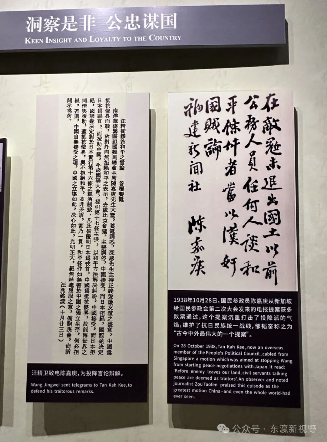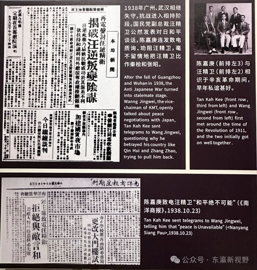 但在1937年“七七事变”爆发后,身为国民党副总裁的汪精卫竟然主张对日妥协,破坏抗日大局,令国人不能容忍。陈嘉庚不顾旧交私谊,以“南洋华侨筹赈祖国难民总会”(简称“南侨总会”)主席名义打了一封电报给汪精卫,指出“和平绝不可能”。在后来发现汪精卫已决心卖国求荣成为汉奸后,陈嘉庚曾连发数封电报质询、劝阻汪精卫,毫不留情地把汪比作秦桧;在1938年10月末日召开的国民参政会一届二次会议上,陈嘉庚以参政员身份向大会提出“敌未出国土前言和即汉奸”11个字的提案,会上一致通过。这个提案,被邹韬奋称之为“古今中外最伟大的一个提案”!