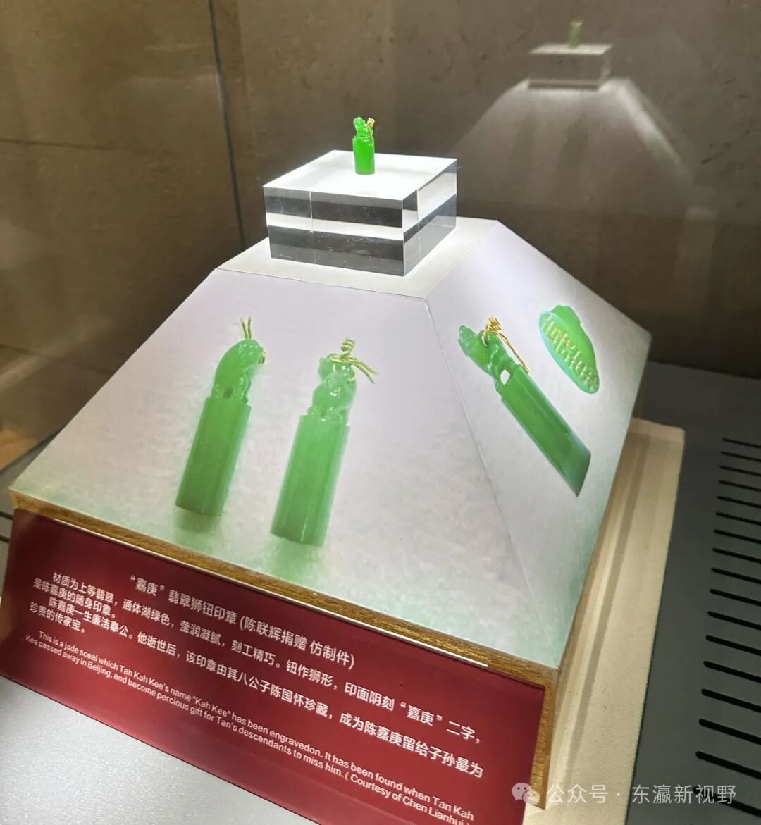 其实,这不是照片,而是笔者拍摄的实物——“嘉庚”翡翠狮钮印章(仿制件)。但令人感动的,却是其中一段文字说明:陈嘉庚的一生廉洁奉公。他逝世后,该印章由其八公子陈国怀珍藏,成为陈嘉庚留给子孙最为珍贵的传家宝。