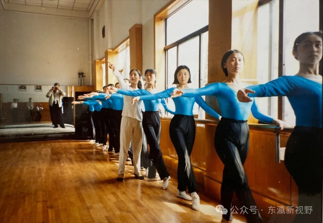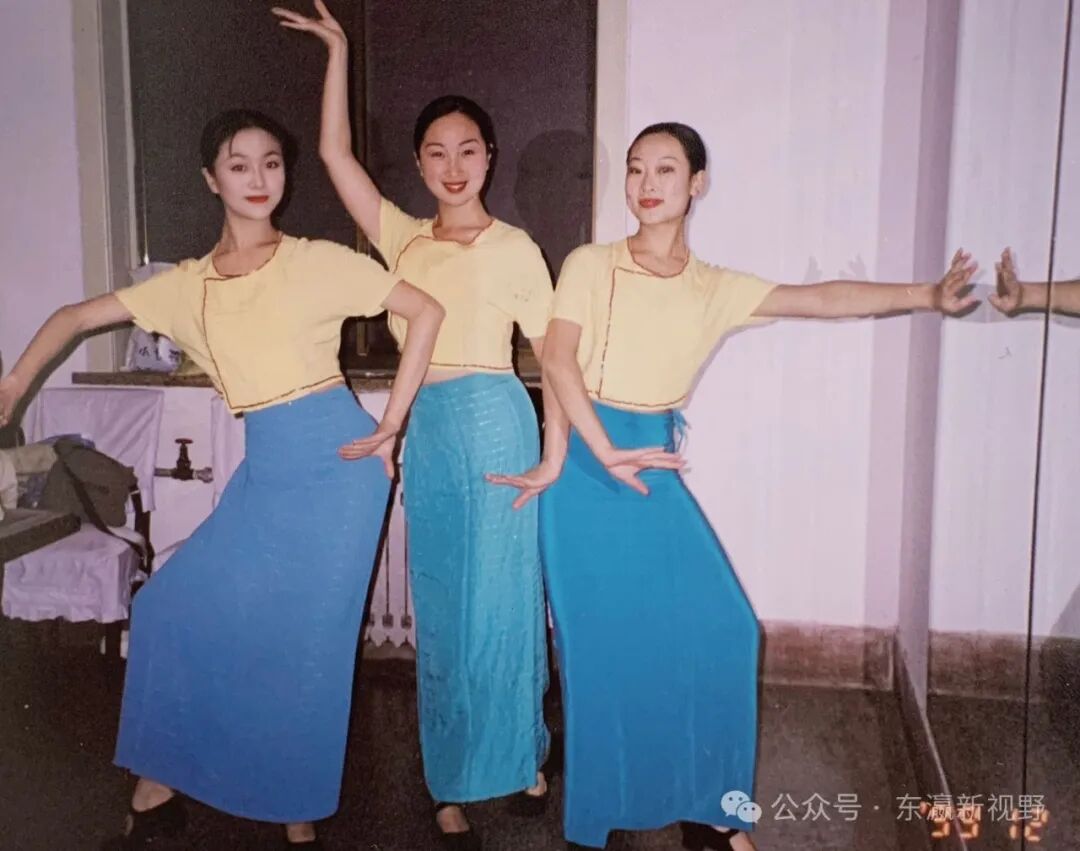 李雅心(左一)高中时代在青岛人民会堂表演傣族舞时在后台秀舞姿