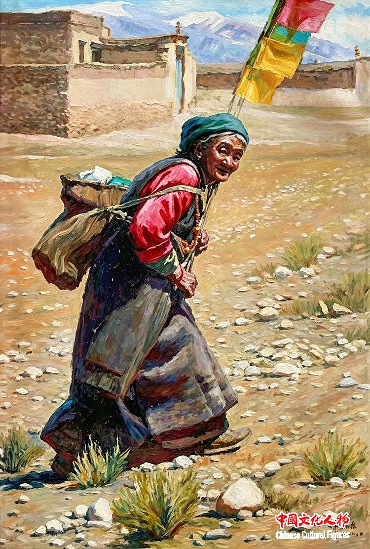 风马旗是西藏宗教文化中的一个符号,一个象征,寓意人们对吉祥安康的祈愿。韩玉臣此幅作品,生动描绘了一个洋溢着幸福微笑的老阿妈,手持多彩风马旗,躬腰缓步前行的感人形象,韩玉臣说:“这幅作品寓意对罗马人民的衷心祝福。”
