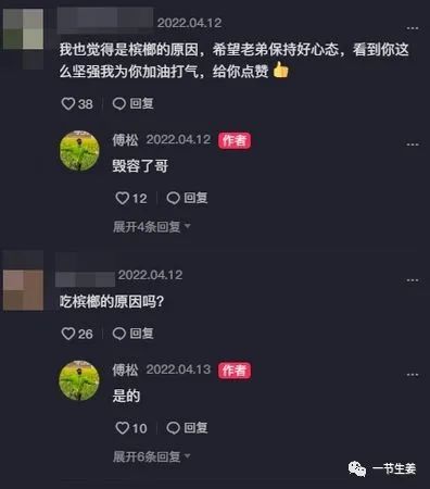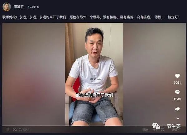 雨裤哥对傅松的简短悼文中,有一个关键词:槟榔。傅松有6年的槟榔史。在社交媒体上,傅松也表示,自己的口腔癌,是嚼槟榔所致。