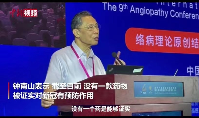 8月20日,在第十八届国际络病学大会、第九届中西医结合血管病学大会上,中国工程院院士钟南山发言指出,“到目前为止, 没有一个药能够被证实对新冠肺炎有预防作用。”