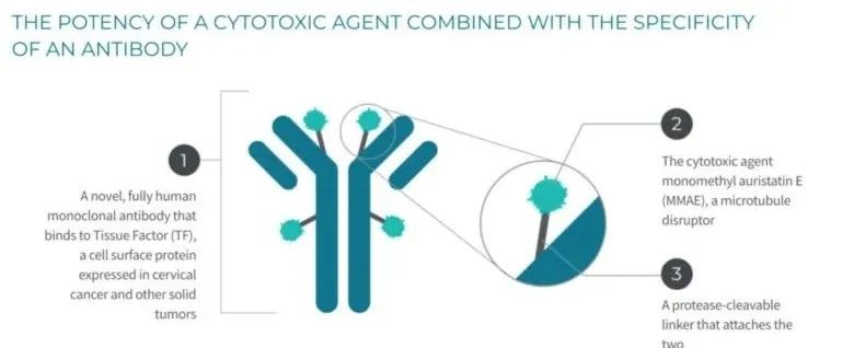 Tivdak (普通药名:Tisotumab Vedotin)是一个ADC药物,用于治疗在化疗中或化疗后疾病进展的复发性或转移性宫颈癌成人患者,于2021年9月20日被FDA加速批准, 已经在美国上市。