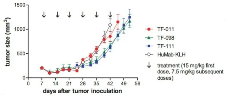 图:裸的TF抗体在动物模型中抗癌活性不理想(文献[8],肿瘤模型为HPAF-II;TF-011, TF-098, TF-111)都是TF抗体,TF -011 最终用于合成ADC)