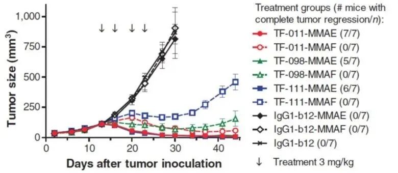 图:TF-ADC在动物模型中 抗癌活性(文献[8],肿瘤模型为HPAF-II,TF -011 –MMAE即最终的Tivdak)