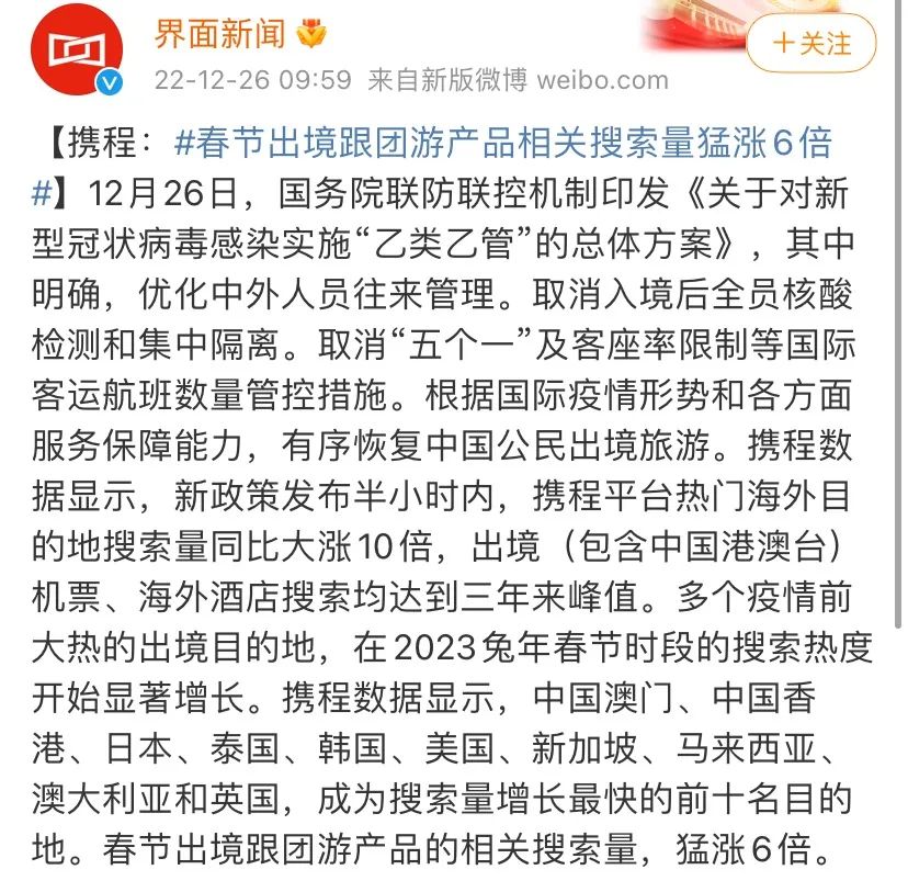 据报道新闻刚出来半个小时,中国出境游的新闻就爆增了6倍。