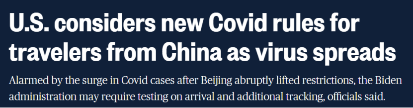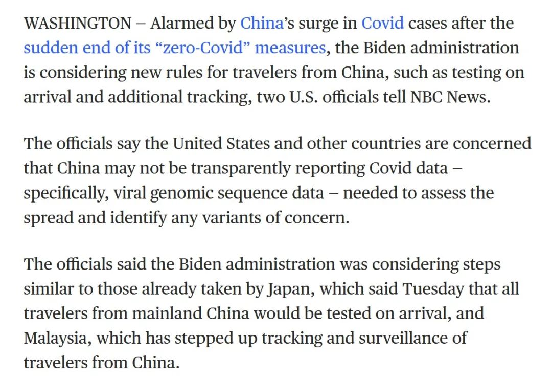中国突然放松了所有新冠疫情限制和控制措施后,国内疫情大爆发。中国同时宣布从1月8号起,近3年来首次对国际旅行重新开放边境之后,中国出境机票销售猛增。但与此同时,包括美国在内的多国,也同时决定或正考虑对来自中国的入境者采取防疫限制措施。美国官员称,拜登政府在得知中国突然解除限制后新冠肺炎激增感到震惊,目前白宫正与公共卫生专家和国际合作伙伴磋商,考虑对来自中国的入境旅客采取新的入境管制措施。目前,美国白宫正与公共卫生专家和国际合作伙伴进行磋商,正在拟定类似的限制措施,如入境检测和额外监测等。美国官员表示,美国以及世界其他国家都担心,中国是否已经完全透明地报告评估传播和识别任何变异毒株所需的新冠肺炎数据,特别是病毒基因组序列数据。美国官员称,任何出台的新措将适用于所有来自于中国的旅客,无论他们国籍如何。然而,目前并未有任何迹象表明,美国正考虑颁布针对中国游客的“旅行禁令”或禁止人们从中国前往美国。本周一(12月26日),中国国家卫健委正式宣布,从2023年1月8日起,入境中国大陆的旅客将不再需要接受隔离,令所有的海外同胞感到激动:3年了,终于等到了这一天。然而,随着中国解除新冠肺炎限制后,新冠肺炎激增,导致日本、马来西亚和印度等国家和地区收紧了中国公民入境的限制。如日本要求来自中国大陆的旅客落地后需进行核酸检测,核酸检测呈阳性的旅客则需要隔离7天,此项政策于12月30日正式生效。此前,日本曾于10月对中国游客重新开放了边境,即所有国际旅客在出发前出示疫苗接种证明或新冠病毒检测阴性结果即可。本周二(12月27日),继日本政府宣布之后,马来西亚政府也已经对中国抵达马来西亚的旅客进行跟踪和监控。印度则表示,将强制对来自中国以及日本、韩国和泰国等国家的旅客进行新冠检测,任何检测结果呈阳性的旅行则将被要求强制隔离。中国台湾则发布信息称,中国大陆的旅客在抵达台湾后必须进行PCR检测,检测结果呈阳性的人需要自我隔离。中国飞往美国机票1月份价格如下:(以当天价格为准)https://www.nbcnews.com/news/us-news/us-biden-considers-china-new-covid-rules-travel-virus-spreads-rcna63435https://www.cnbc.com/2022/12/28/us-new-measures-travelers-from-china.html