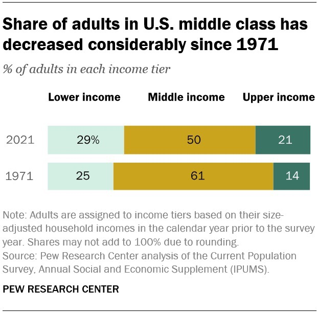 2.1970年以来,中产阶级在美国家庭总收入中的份额持续下降。收入差距扩大和中产阶级萎缩,导致中产阶级家庭持有的美国总收入份额稳步下降。1970年,中等收入家庭成年人收入占总收入的62%,这一比例在2020年下降到42%。