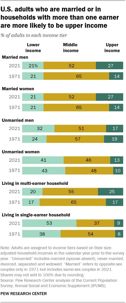 2021年,未婚男性和女性比其已婚同事更可能处于低收入阶层。尤其未婚男性,50年间在低收入层份额增加显著,在中等收入层份额也有同样大的退步。尽管如此,比起未婚女性,未婚男性更可能成为中等收入者更非低收入者。