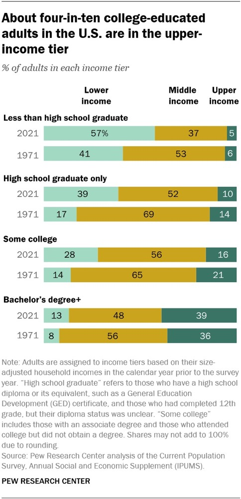 另一方面,没有至少学士学位的群体出现了明显的经济倒退。在过去50年里,有高中及以下文凭的成年人,以及有大学经历但没学位的人,在低收入阶层份额中有相当大的增长。尽管统计期间内没有任何一个教育类别的成人群体收入有明显提高,但成人总体通过提高教育水平可以有所收获。2021年,25岁及以上成年人中,完成至少四年大学教育的比例为38%,而1971年只有11%。