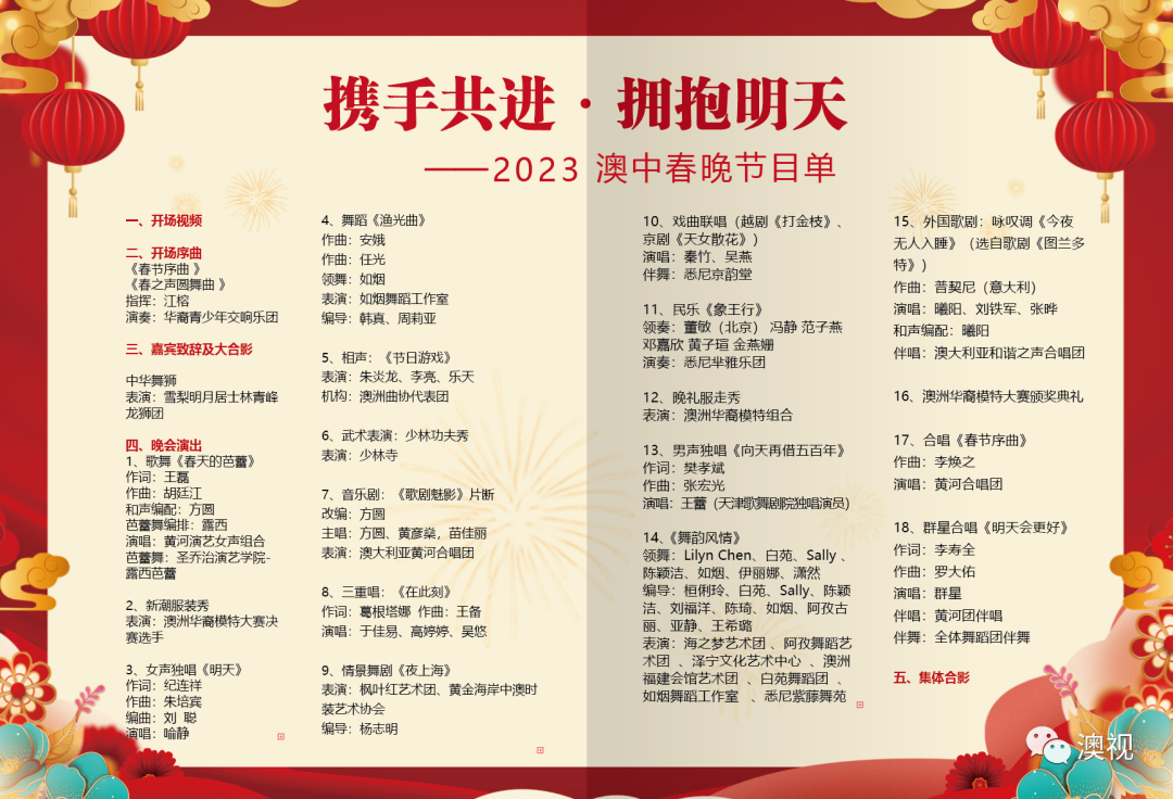 全球华人共同关注的2023澳中春晚,以“明天会更好”为主题,旨在欢乐中传递希望,展现澳洲华人过年盛景。疫情三年落幕,万象更新、春晚回归,本次活动是澳洲华人历史的里程碑。