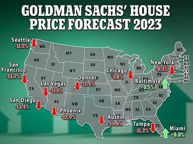 美联储正大战通货膨胀,抵押贷利率重挫楼市,从3%一路飙升到2022年的7%。现房销量连续10个月降到十多年来最低水平,引发了2008年经济危机以来最大价格调整。高盛公司今年初发布了一份住房市场预测报告,预计今年房价将暴跌,全美范围内房价下降6%后再上升,几个城市峰值到谷底降幅为25%。西南地区和太平洋沿岸楼市过热,预计东北部、东南部和中西部价格修正会较温和,但也有地区逆势略有上升。加州圣何塞、德州奥斯汀、亚利桑那凤凰城和加州圣地亚哥,预计将受最重打击,跌幅或达25%,可与2007-08年全球金融危机时全美房价暴跌27%情况相媲美。奥斯汀2021年被Zillow评为美国最热地产市场,2023年已降至第30位。公司报告称市场“冰冷”,挂牌平均68天,比美国任何其他主要城市都多。不过奥斯汀地产经纪人委员会反驳称仍有“难以置信的高需求”。房价现两位数跌幅:奥斯汀(-15.6%)、旧金山(-13.7%)、圣地亚哥(-13.4%)、凤凰城(-12.9%)、丹佛(-11.4%)、西雅图(-11.2%)、坦帕(-11.2%)和拉斯维加斯(-11.1%)等主要市场。房价略有下降:芝加哥(-1.8%)和纽约(-0.3%)小幅上涨:巴尔的摩(+0.5%)和迈阿密(+0.8%)总体而言,高盛预测今年美国房价将下降6.1%,意味着2022年6月到今年底,美国房价从高峰到低谷累计跌幅约为10%。报告说:“全美降幅应小到避免广泛抵押贷承压,全美范围似乎不太可能猛增取消赎回权。”不过报告给出的希望是,预测楼市不会像2008年那样经历长期衰退,2024年房价将整体上涨1%左右。假设经济仍然在软着陆轨道上,避免经济衰退,并且30年固定抵押贷款利率在2024年底前回落到6.15%,那么2024年房价将可能从贬值转向低于趋势的升值。抵押贷款利率仍然不可预测,11月达到了7.37%的峰值,在通胀好于预期后,平均30年固定抵押贷已降至6.09%。△2022年9月~2023年1月,美国各地30年期抵押贷款利率变化。其他方面的预测,全国房地产经纪人协会首席经济学家Lawrence Yun表示2023年看到整个国家有“希望的迹象”,预计住房价格将平均持平。“全美有一半地区或将出现小幅价格上涨,另一半地区可能现轻微价格下跌。”不过加州圣何塞所在的湾区是例外,他预测2023年将现潜在10-15%的降幅。“抵押贷款利率是推动房屋销售的命脉”,本周30年期贷款平均利率为6.15%,比2022年9月的7.08%高点低了近一个整点。根据房地美数据,去年此时同样利率是3.56%。虽然随着需求减少,房价有所回落,但仍比一年前高出近11%。更高的价格和翻倍的抵押贷利率让更多人对卖房望而却步,最近利率下降或许能给一些购房者带来新的希望。2022年最后一次会议上,美联储第7次加息,将利率提高了0.5%,将央行关键利率推至4.25%~4.5%,这是15年来的最高水平。尽管消费者层面通胀率已连续6个月下降,但美联储官员表示可能会在2023年将央行主要借款利率再提高四分之三,至5%~5.25%的范围。30年期抵押贷款利率通常跟随10年期国债收益率的变化,贷款机构将其作为定价指南。投资者对未来通胀的预期、全球对美国国债的需求,以及美联储对利率的影响,也会影响房屋借贷成本。受再融资者欢迎的15年期抵押贷款利率本周也有所下降,从上周的5.52%降至5.28%。一年前为2.79%。