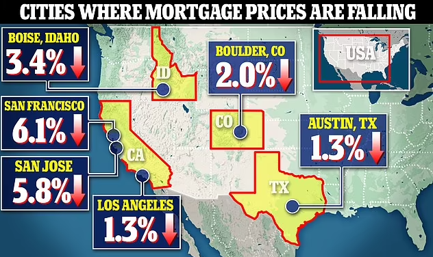这些城市包括爱达荷州博伊西(Boise),房价比一年前下跌3.4%,德克萨斯州奥斯汀价格下跌1.3%。