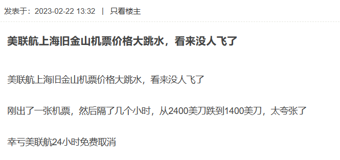 我们注意到,有网友在一些论坛上表示发现美联航上海飞往旧金山的机票大跳水,表示“看来是没人飞了”