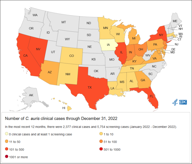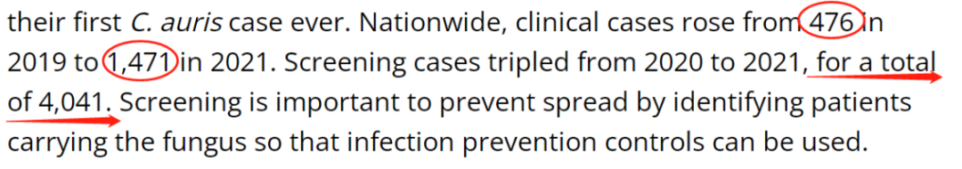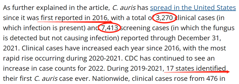 图片来源于CDC官网。研究表明,导致耳念珠菌(C. Auris)感染病例增加的原因有很多,特别是在2019年至2021年间,新冠疫情压力下,美国医疗机构很难采取有力措施阻断该病菌不断传播。CDC报告称,耳念珠菌(C. Auris)通常不会对健康人构成威胁,但患重病、接受侵入性医疗设备治疗、以及长期或频繁在医疗保健机构住院的人群感染风险较大。该病毒可引发严重的侵入性感染,包括血液感染、伤口感染和耳部感染等。研究表明,耳念珠菌对多种抗真菌药物具有耐药性,容易在医疗保健机构中传播,且死亡率较高。近一半感染耳念珠菌(C. Auris)的患者会在90天内死亡,且感染者中有30%-60%死亡率。真菌性疾病分部的医务人员莱曼(Meghan Lyman)表示,他们并不确定有多少病故可以直接归因于真菌,因为感染者通常还面临着其他多种健康威胁。耳念珠菌(C. Auris)既可能直接导致死亡,也可能与其他健康问题一同加速患者身体状况恶化。CDC研究人员在美国知名医学期刊《内科医学年鉴》(Annals of Internal Medicine. Equally)发表这项研究,主要分析了耳念珠菌(C. Auris)近年来在美国的传播和感染状况。据悉,美国于2016年发现首例耳念珠菌(C. Auris)感染病例,截至2021年12月31日,共报告了3,270例临床病例(其中存在感染)和7,413例筛查病例(其中检测到真菌但未导致感染)。其中2020至2021年在医疗保健机构以“惊人速度”传播。自2019年至2021年,已有17个州报告确诊病例。在全美范围内,临床病例从2019年的476例上升到2021年的1,471例。从2020年到2021年,筛查病例数增加了两倍,共计4,041例。筛查对于通过识别携带真菌的患者来防止传播是非常重要的,可以预防并控制感染。UMass Amherst微生物实验室教学服务主任汉伊利卡·哈密尔顿(Erika Hamilton)教授表示,“正常人感染该真菌的可能性很小,但是免疫力低下或住院的人则不同。感染的人已经病入膏肓,当你已经病入膏肓时,很难确定你感染了什么。”“一旦耳念珠菌(C. Auris)进入血液,就很难被发现,然后导致全身感染。虽然通常真菌感染是可以治疗的,但耳念珠菌(C. Auris)能够抵抗多种可用的治疗方法。市场上没有那么多抗真菌药物,我们现有的抗真菌药物对这种特殊真菌的作用也不尽如人意,所以这真的很难治疗,”哈密尔顿(Hamilton)教授补充道。“病例的快速上升和地域性传播令人担忧,应当强调监测重要性,扩大实验室能力,更快的诊断测试,并坚持行之有效的感染预防和控制,”CDC流行病学家梅根·莱曼(Meghan Lyman)教授说道。耳念珠菌(Candida Auris)是一种“超级真菌”且常见于院内感染,对于医院或疗养院内患有其他疾病的患者来说,“超级真菌”是一种可能致命的威胁。耳念珠菌(C. Auris)进入人体后会随着血液扩散至全身,导致严重的侵袭性感染。而且,用标准的实验室方法很难鉴定,在没有特定技术的实验室里也可能被错误鉴定。错误识别可能导致治疗不及时。耳念珠菌(Candida auris)感染症状可能因感染部位的不同而异,感染常常不易被诊断,因为其症状可能与其他感染或疾病相似。但常见的症状包括: