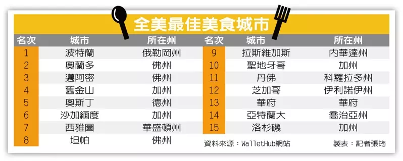 (WalletHub)网站因此根据29个单项,为全国逾180座城市评分,排出全美最佳美食城市榜单,评比单项包括民众日常食品采购开销、城市人均餐厅数量、商家多元性、高档餐厅的可负担性及便利程度、特色咖啡厅、路边小吃和甜点商家的数量等。结果显示,综合排名第一的为俄勒冈州的波特兰(Portland)第二、三名分别为佛罗里达州的奥兰多(Orlando)和迈阿密(Miami)华府总分排名第13,是大华府地区唯一冲进全国前15的城市。