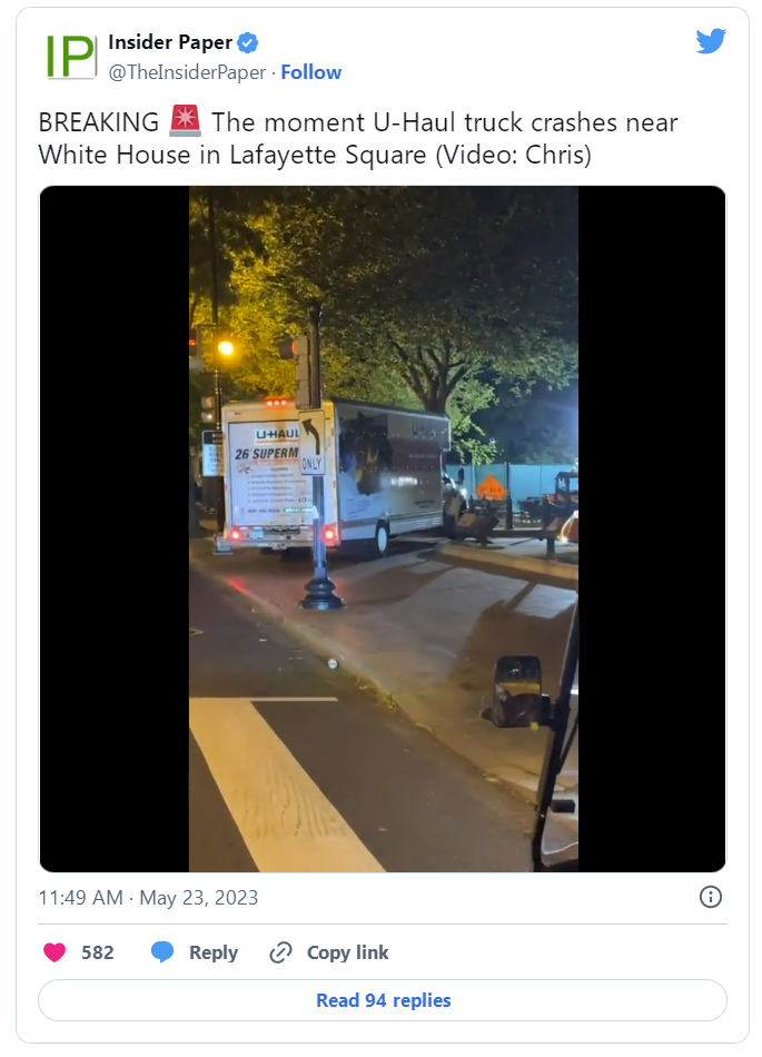 美国特勤局人员表示,有辆货车在当地时间22日晚上9时许撞上白宫外拉法叶广场(Lafayette Square)的安全护栏,司机立刻遭到逮捕,为了预防万一周围的道路已经封闭,也撤离了附近饭店的住客,目前事故原因仍在调查当中。综合外媒报导,美国华盛顿特区一辆搬家货车在当地时间晚上9时许,撞上白宫外拉法叶广场北侧的安全护栏,而位置就在总统住家的对面。尽管没有造成人员伤亡,但警方为求谨慎,立刻封锁附近道路,并疏散了附近Hay Adams饭店的住客。从推特曝光的画面可以看到,司机在第一次撞上护栏之后,疑似为了移动车辆而二度撞上护栏。特勤局表示,目前肇事司机已经被拘留,而执法人员则透过机器人撬开了货车的门,里面除了手推车之外,没有其他可疑物品。