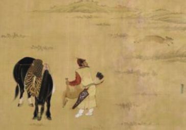 初见画片,常人都会认为是一件胡人行猎图绘,不论从满脸的络腮还是胡服装束来说似乎都毫无疑问,然而同样类型的题材又似乎似曾相识,而且应该出自某件书画作品,感觉十分情切熟悉。