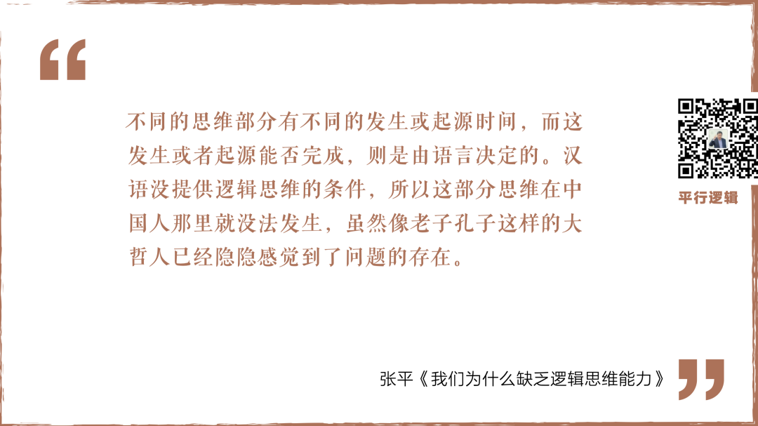 语言对思维发展的决定性作用,古汉语逻辑问题是个很好的例子,语言和思维的起源都是漫长而复杂的过程,并不存在一个绝对的起源点。不同的思维部分有不同的发生或起源时间,而这发生或者起源能否完成,则是由语言决定的。汉语没提供逻辑思维的条件,所以这部分思维在中国人那里就没法发生,虽然像老子孔子这样的大哲人已经隐隐感觉到了问题的存在。反之,如果汉语本身严谨一些的话,后期墨家也许就能发展出希腊人那样的逻辑体系来,中国人的思维方式也许就完全不一样了。