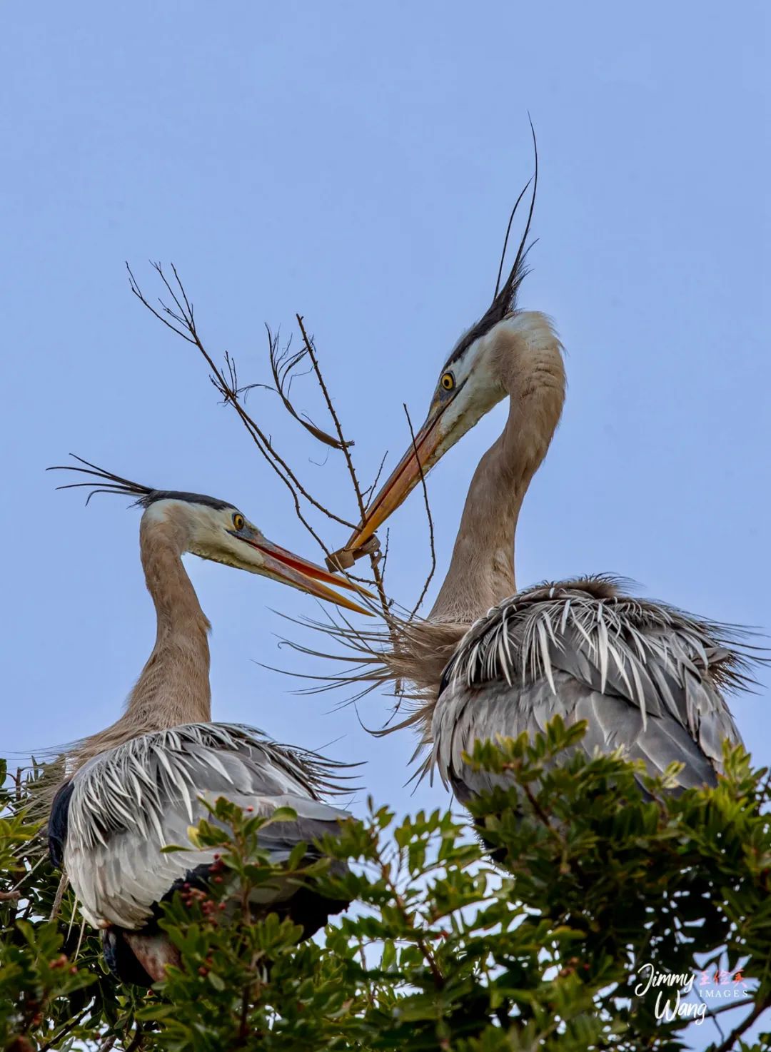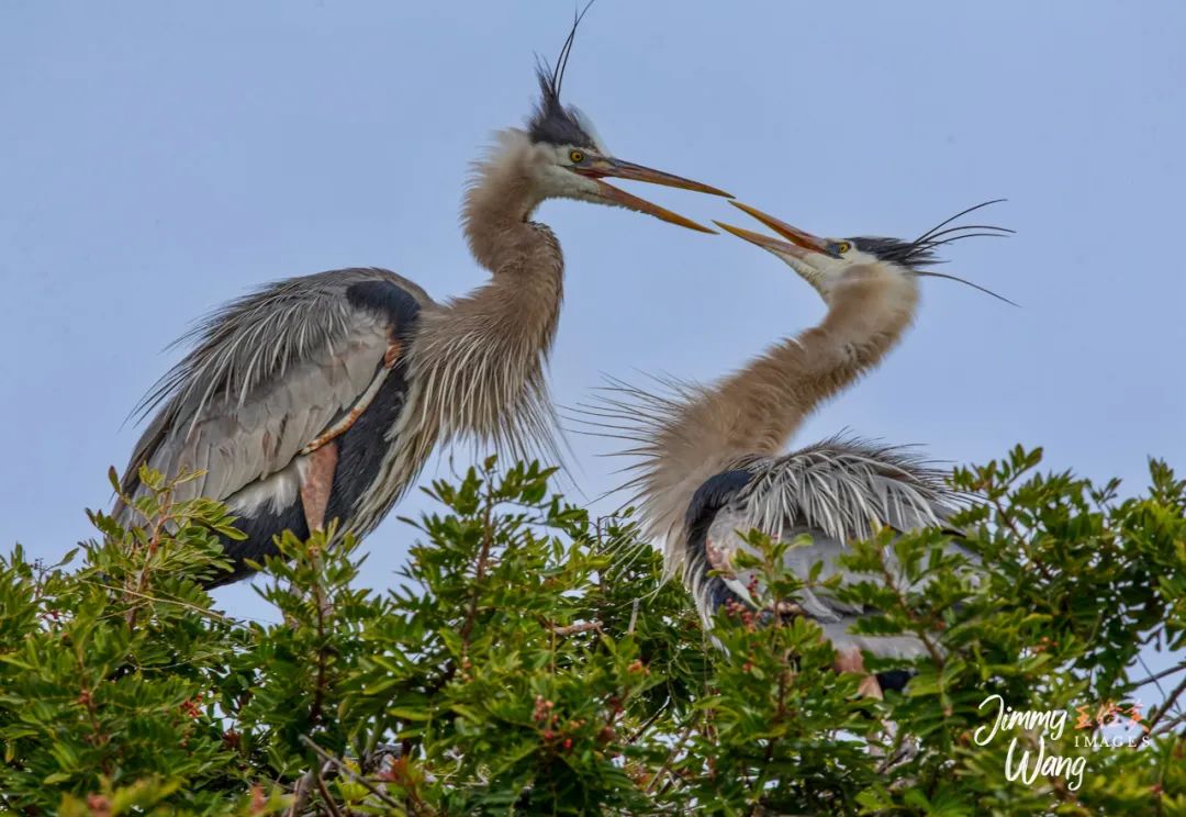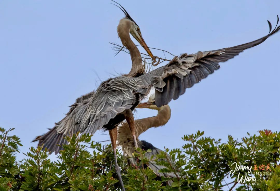大灰鹭(Great Grey Heron),又叫苍鹭,是大型涉禽,颈、脚甚长,全身羽毛均呈灰色,头顶具有稀疏的黑色发状短羽。分布在有江水的地方,沿江分居,以小鱼、小虾、小虫为食。