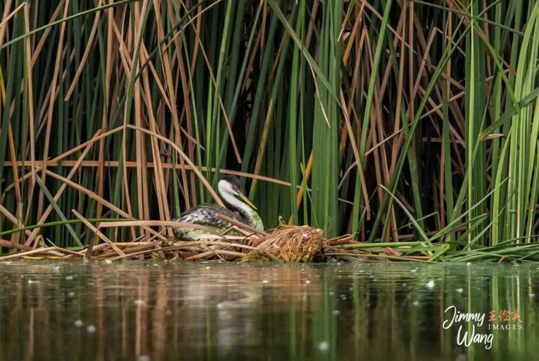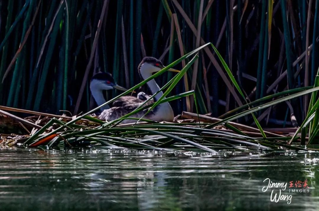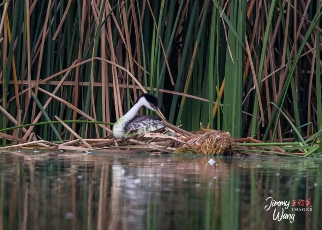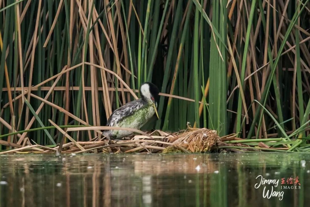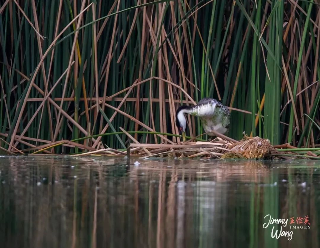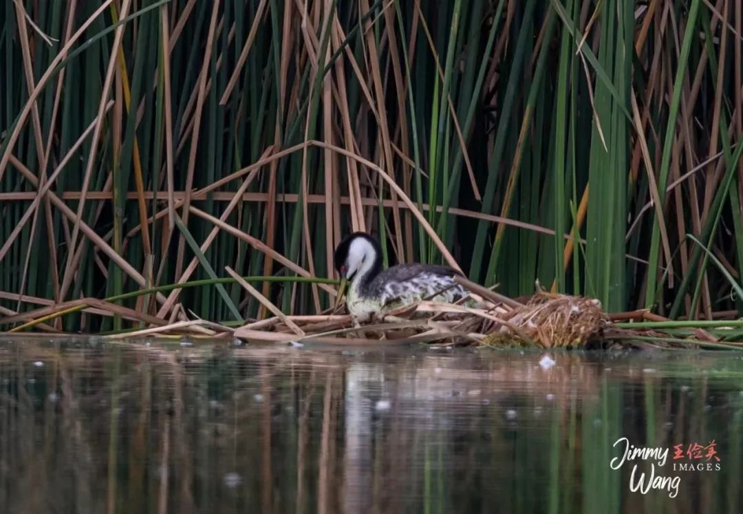 “一家三口”标配,趴窝孵蛋的雌鸊鷉在公鸊鷉的护卫下还在“坐月子”,羽背上已有刚刚破壳面世的幼仔。