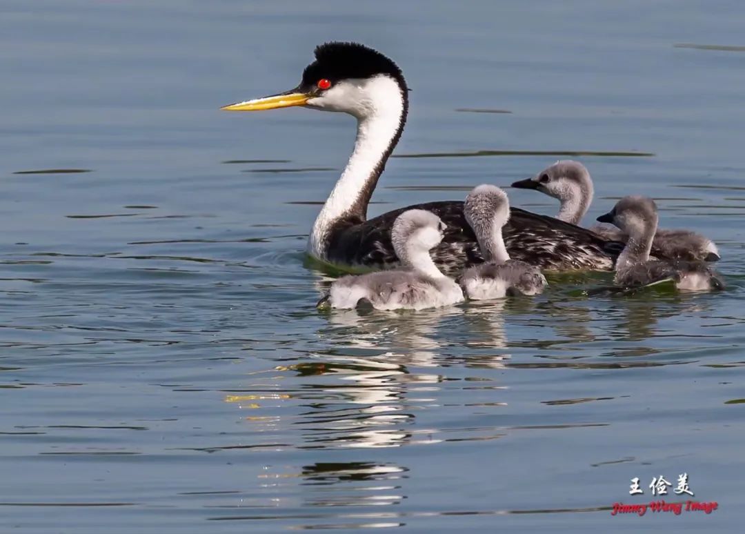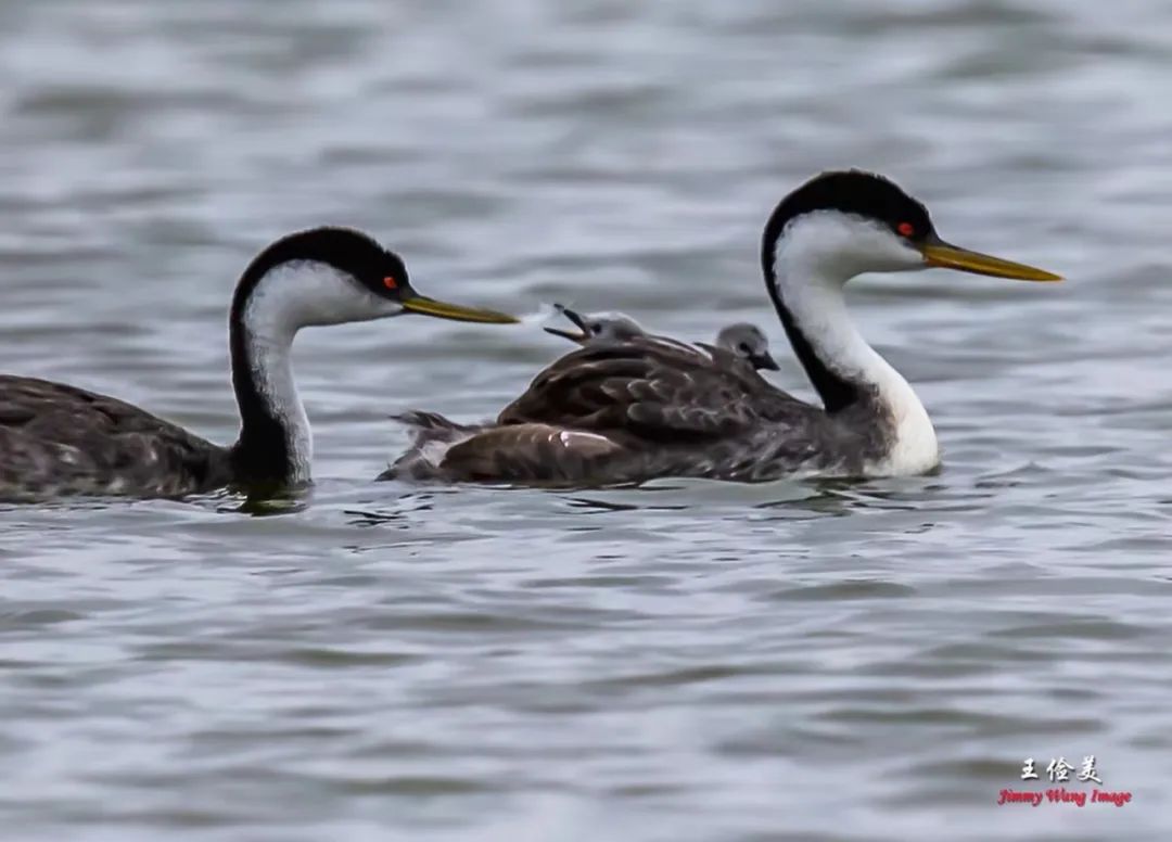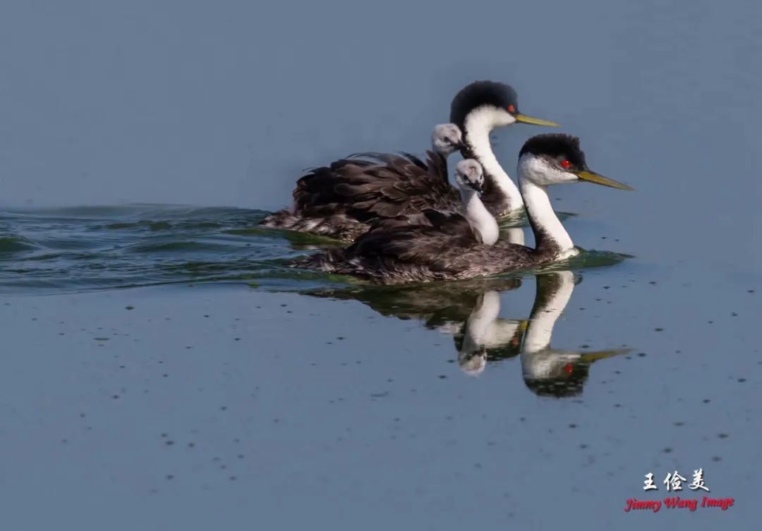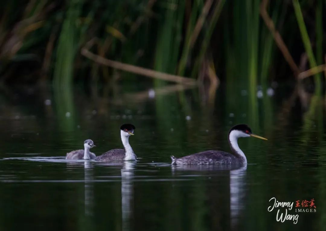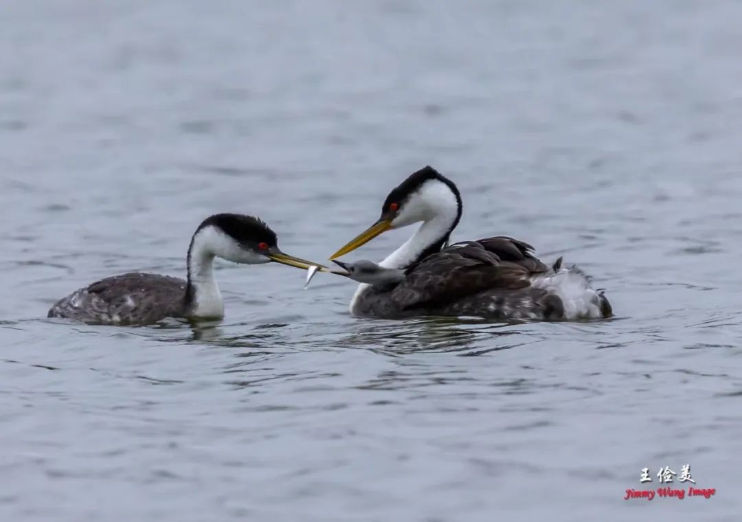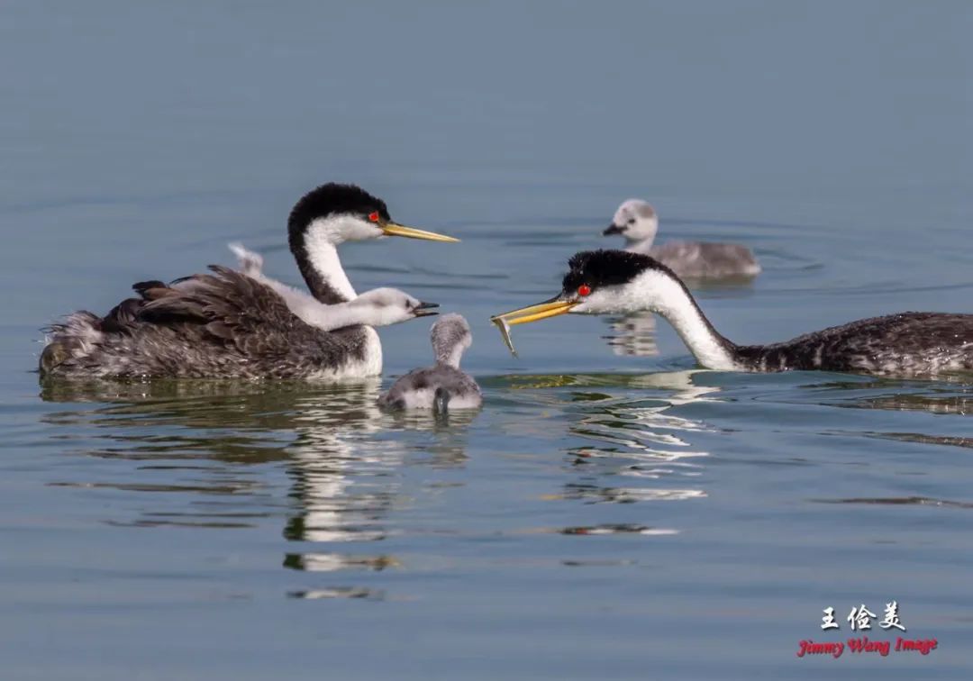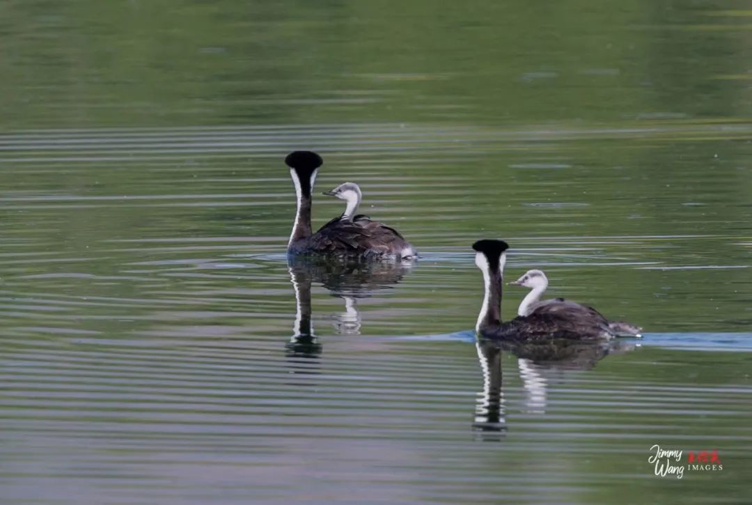 鸊鷉(Grebes)趴窝孵蛋,以及带娃喂鱼。添丁进口后,这边厢年幼的鸊鷉跟着爹娘出游。