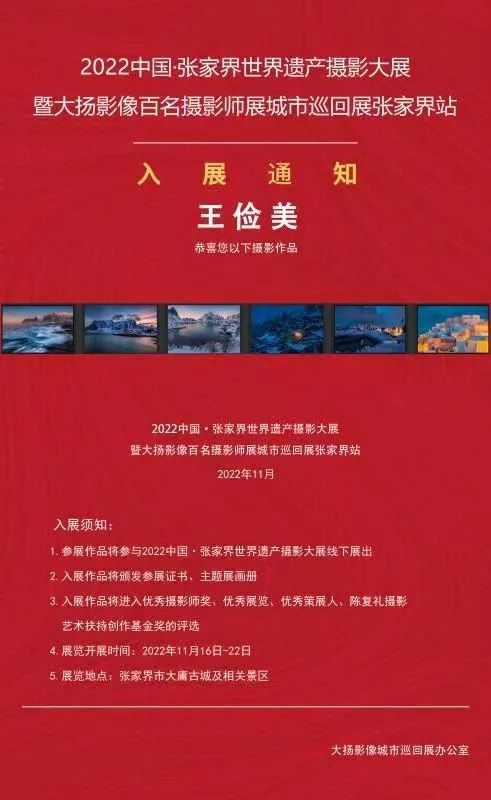 本人这组风光摄影作品系列入展中国摄影家协会与湖南省文学艺术界联合会主办的张家界第二届世界遗产摄影大展,学无止境,继续努力!图1,入展通知函。