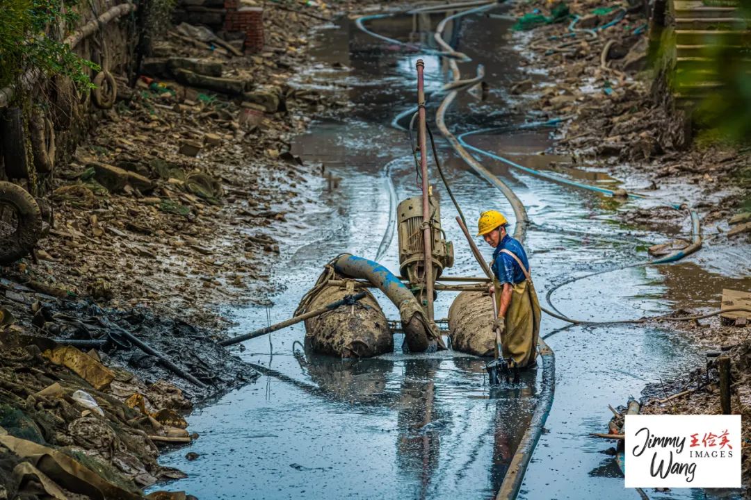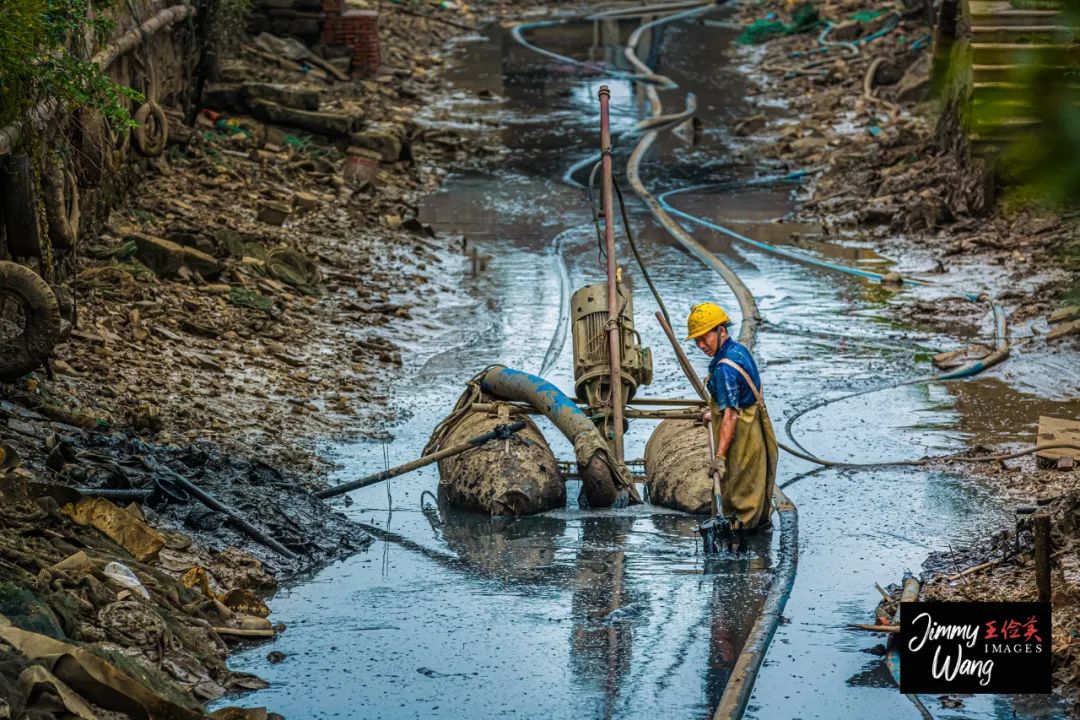 这张图片是我在江苏苏州郊区拍摄的。当时,我们去参观访问,看到排污工人正头顶烈日站在臭气熏鼻的河里清污。他们为了创造美好的环境负重前行,我深深感动,就抓拍了这张照片,致敬给城市“洗脸、“洗肺”的人。
