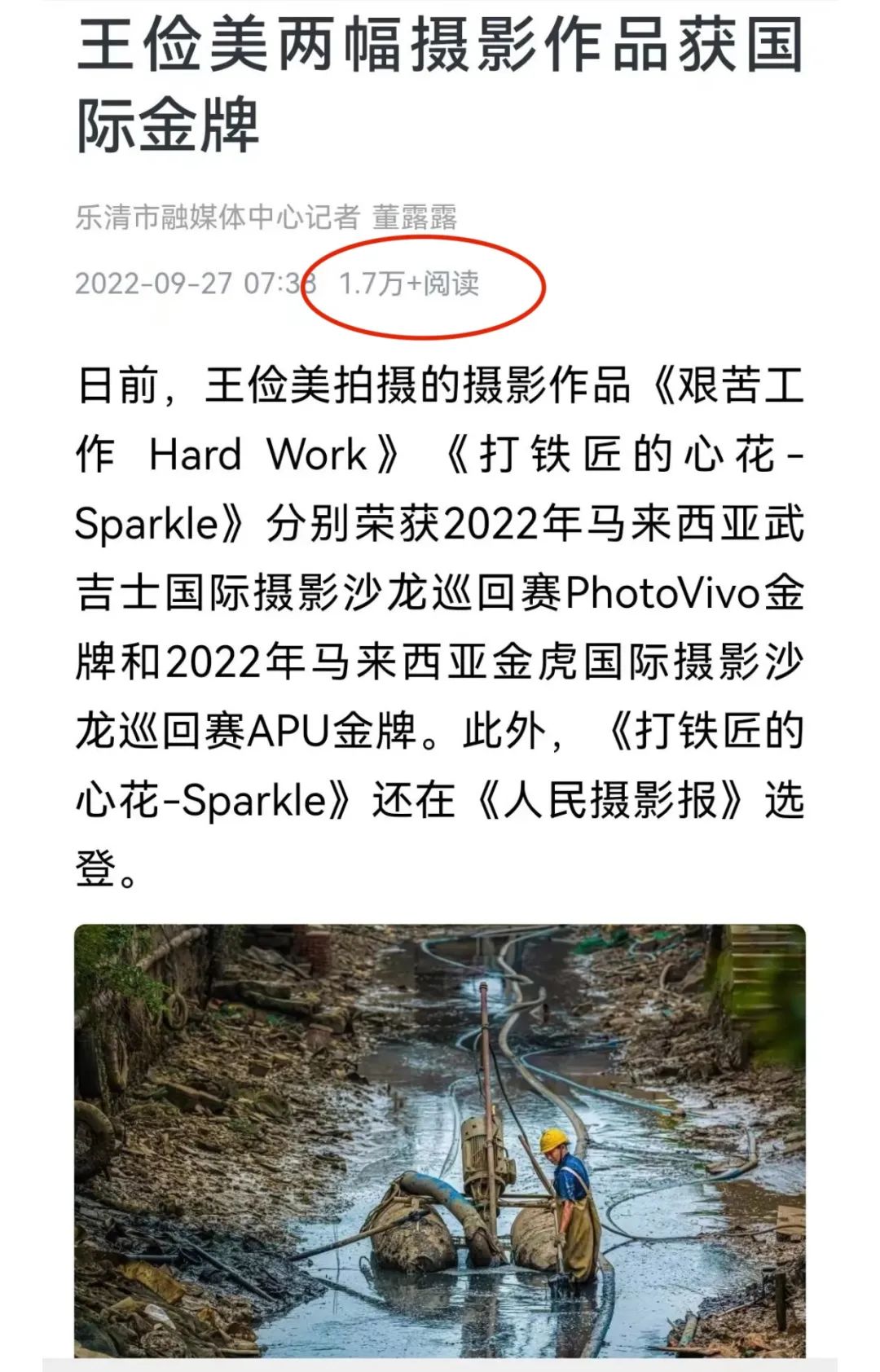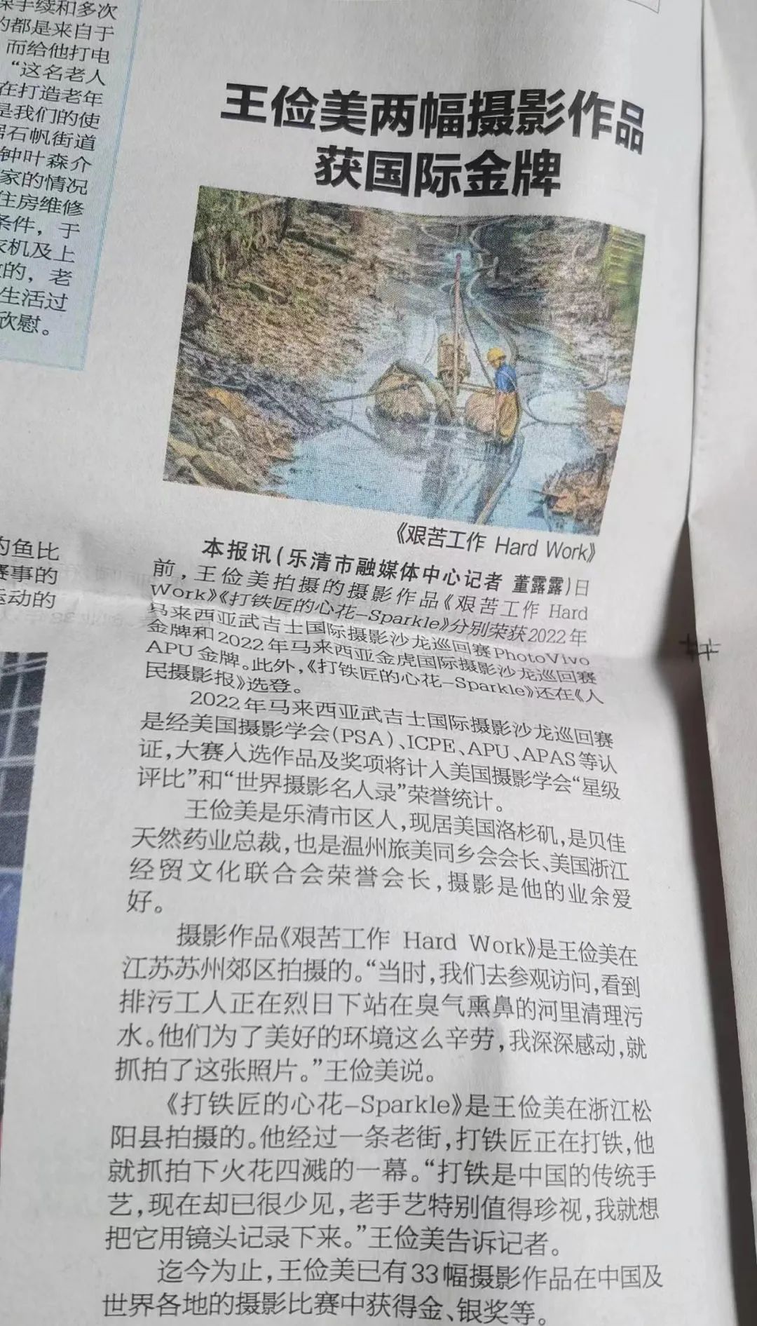 此前提到过,本人摄影作品《艰苦工作 Hard Work》、《打铁匠的心花-Sparkle》分别荣获2022年马来西亚武吉士国际摄影沙龙巡回赛PhotoVivo金牌和2022年马来西亚金虎国际摄影沙龙巡回赛APU金牌。此外,《打铁匠的心花-Sparkle》还在《人民摄影报》选登。9月27号,家乡温州《乐清日报》报道此事,还简述了图片拍摄过程。